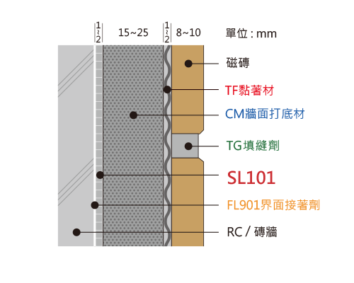 適合用於混凝土牆面與打底材或粉光材之黏結材料;灰誌、灰誌條施工。
